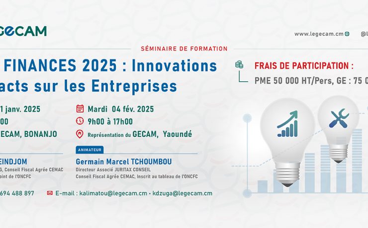 Le GECAM à travers son bureau des formations organise une formation sur le thème : « Loi de Finances 2025 : Innovations et impacts sur les Entreprises » Le Vendredi 31 janvier 2025 au siège