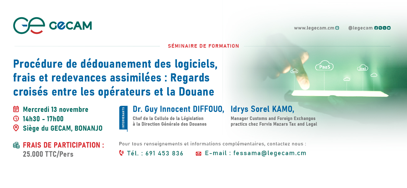 Nous avons le plaisir de porter à votre connaissance que la Commission Fiscale et Douanière du GECAM organise la 1ère session des Cliniques fiscales et douanières de l’année 2024 sur le thème : Procédure de dédouanement des logiciels, frais et redevances assimilées : Regards croisés entre les opérateurs et la Douane. Cette session se tiendra le :