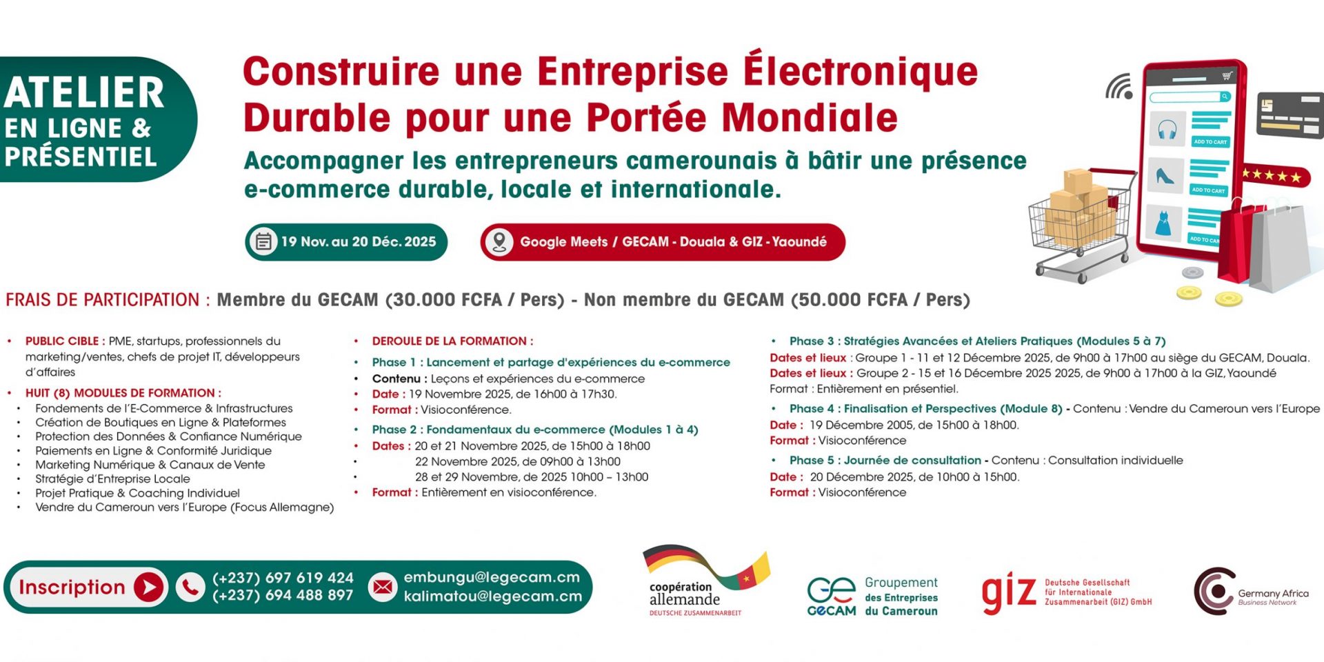 Nous avons le plaisir de porter à votre connaissance que, le GECAM organise en partenariat avec la GIZ, un atelier de formation sur le thème « Construire une Entreprise Electronique Durable pour une Portée Mondiale » :