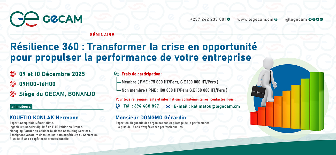 Nous avons le plaisir de porter à votre connaissance que, le GECAM organise en partenariat avec la GIZ, un atelier de formation sur le thème « RÉSILIENCE 360° : Transformer la crise en opportunité pour propulser la performance de votre Entreprise » :
