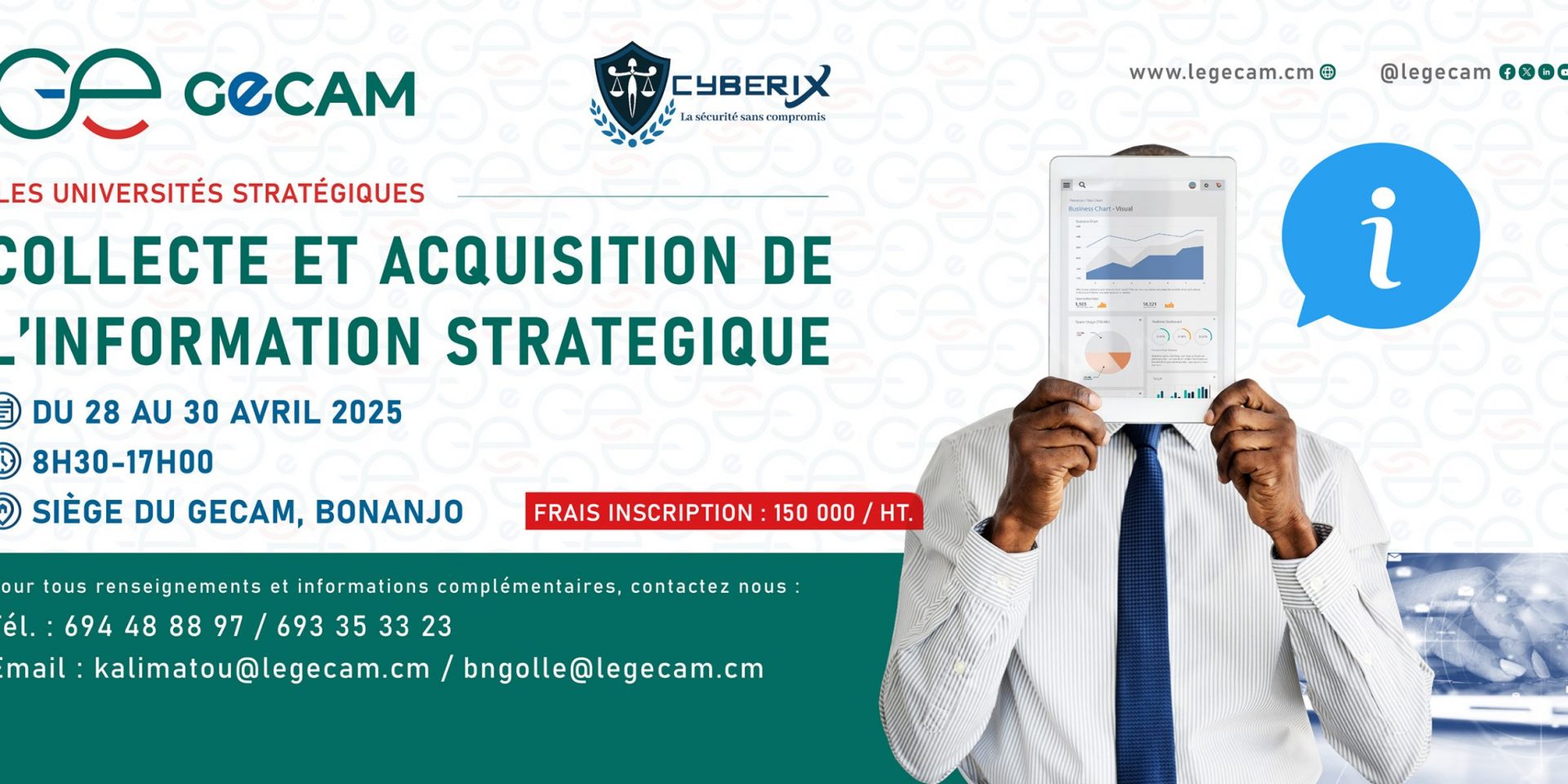 Le GECAM, en partenariat avec CYBERIX, vous invite à participer à la première session des « Universités Stratégiques 2025 ». Cet événement est destiné aux chefs d’entreprises, cadres dirigeants, et responsables de services. Les participants apprendront à identifier, collecter et valider des informations stratégiques fiables pour optimiser leurs prises de décision, maîtriser les techniques de veille pour surveiller les tendances du marché, anticiper les opportunités et détecter les menaces potentielles, et adopter des outils modernes et des méthodes opérationnelles pour maximiser leur avantage stratégique. Pour toute autre information, n’hésitez pas à nous contacter aux adresses ci-après : 694 488 897 / kalimatou@legecam.cm ou 693 353 323 / bngolle@legecam.cm.